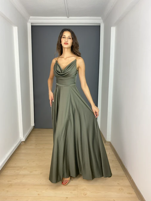 - Kırmızı Saten A Kesim Degaje Yaka Zincir Askılı Uzun Abiye Elbise